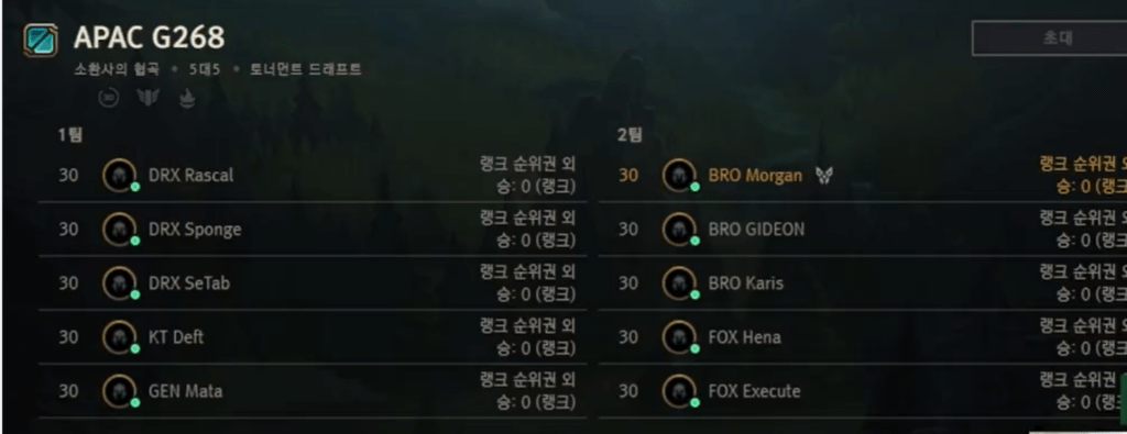 Three DRX players were on one team, alongside KT Deft and GEN Mata (coach). The other team had three BRO players and two FOX (FearX) players.